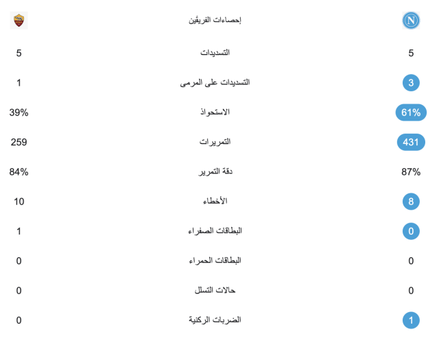 في الكورة : إحصائيات مباراة روما ونابولي بعد مرور ساعة