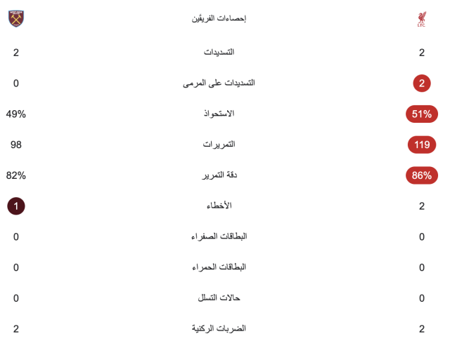 في الكورة : إحصائيات نصف ساعة من مباراة ليفربول ووست هام
