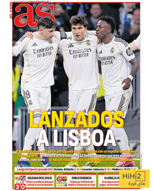 مرحبا كورة – مباراة ريال مدريد مع بنفيكا كانت على غلاف صحيفة AS الإسبانية اليوم الاثنين 16 فبراير 2026.