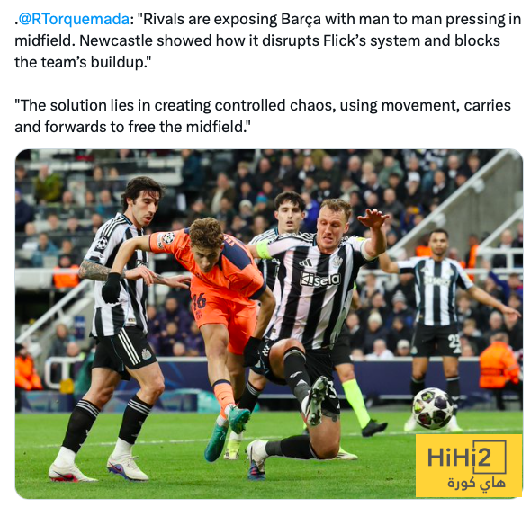 “المنافسون يستغلون نقاط ضعف برشلونة من خلال الضغط الفردي في خط الوسط، وقد أظهر نيوكاسل كيف أن هذا الأسلوب يربك خطة فليك ويعوق بناء هجمات الفريق”.