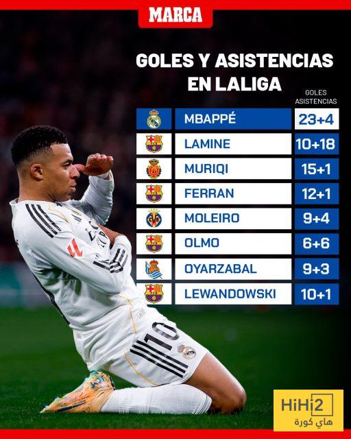 مرحبا كورا – يتصدر كيليان مبابي قائمة اللاعبين الأكثر مساهما في الأهداف في الدوري الإسباني هذا الموسم، بـ 27 مساهمة بين أهداف وتمريرات حاسمة.
