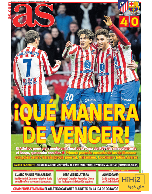 مرحبا كورة – تصدر فوز أتلتيكو مدريد الساحق على برشلونة (0-4) في ذهاب نصف نهائي كأس ملك إسبانيا غلاف صحيفة آس الإسبانية اليوم الجمعة 13 فبراير 2026.
